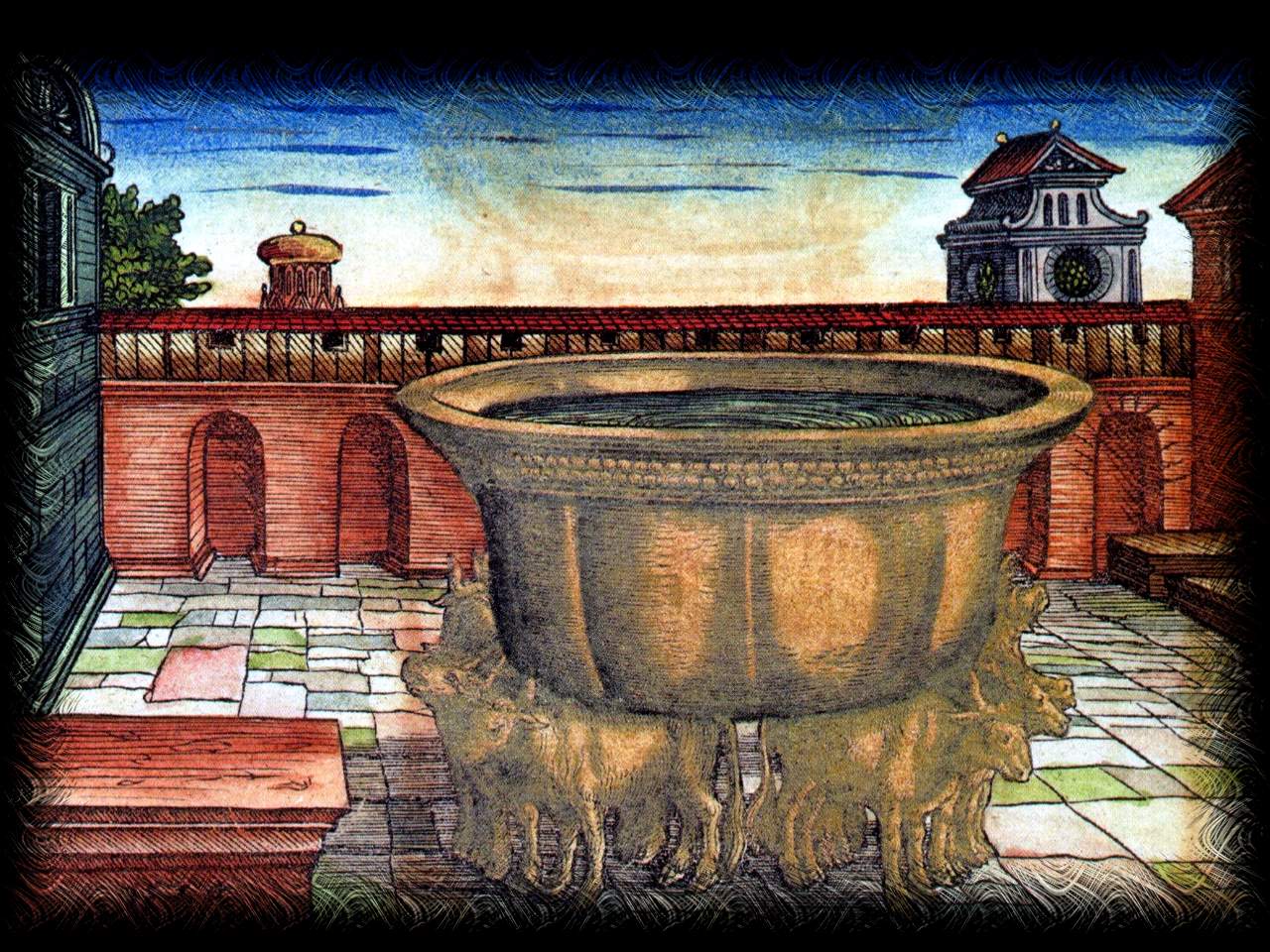 Capitel: 1 2 3 4 5 6 7 8 9 10 11 12 13 14 15 16 17 18 19 20 21 22 Die gantze Heilige Schrifft: Deudsch (Luther 1545) Das erste Buch der Könige Capitel 7 Aber an seinem Hause bawete Salomo dreizehen jar / das ers gantz ausbawet / 2 nemlich / Er bawet ein Haus vom wald Libanon / hundert ellen lang / funffzig ellen weit / vnd dreissig ellen hoch. AVff das selbige geuierde / leget er den Boden von Cedern brettern / auff Cedern seulen nach den riegen hin. 3 Vnd oben drauff ein Gezimer von Cedern / auff dieselben Seulen / welcher waren fünff vnd vierzig / ja funffzehen in einer riege. 4/5 VND waren Fenster gegen die drey riegen gegen ander vber / drey gegen drey / vnd waren in jren pfosten vierecket. 6 ER bawet auch eine Halle von seulen / funffzig ellen lang vnd dreissig ellen breit. Vnd noch eine Halle fur diese / mit seulen vnd dicken balcken. 7 VND bawet auch eine Halle zum Richtstuel / darin man gericht hielt vnd teffelt beide boden mit Cedern. 8 DAzu sein Haus / darinnen er wonet / im hinder Hof / hinden an der Hall / gemacht wie die andern. VND macht auch ein Haus / wie die Halle der tochter Pharao / die Salomo zum Weibe genomen hatte. 9 SOlchs alles waren köstliche Steine nach dem Winckeleisen gehawen / mit segen geschnitten auff allen seiten / von grund bis an das dach / Dazu auch haussen der grosse Hof. 10 Die Grundfeste aber waren auch köstliche vnd grosse Steine / zehen vnd acht ellen gros / 11 vnd darauff köstliche gehawene Steine nach dem Winckeleisen / vnd Cedern. 12 Aber der grosse Hof vmbher hatte drey riegen gehawen Stein / vnd ein riege von Cedern brettern / Also auch der Hof am Hause des HERRN inwendig / vnd die Halle am Hause. 13 VND der könig Salomo sandte hin vnd lies holen Hiram von Tyro 14 einer widwen Son / aus dem stam Naphthali / vnd sein Vater war ein man von Tyro gewesen / Der war ein Meister im ertz / vol weisheit / verstand vnd kunst zu erbeiten allerley Ertzwerck. Da der zum könige Salomo kam / machet er alle seine werck. 15 VND machet zwo eherne Seulen / eine jgliche achzehen ellen hoch / vnd ein faden von zwelff ellen war das mas vmb jgliche seulen her. 16 Vnd machet zween Kneuff von ertz gegossen / oben auff die seulen zusetzen / vnd ein jglicher knauff war fünff ellen hoch. 17 Vnd es waren an jglichem Knauff oben auff der seulen sieben geflochten Reiffe / wie keten. 18 Vnd macht an jglichem knauff zwo riegen Granatepffel vmbher / an einem reiffe / da mit der knauff bedeckt ward. 19 Vnd die kneuffe waren wie die Rosen fur der Halle / vier ellen gros. 20 Vnd der Granatepffel in den riegen vmbher waren zwey hundert / oben vnd vnten an dem reiffe der vmb den bauch des knauffs hergieng / an jglichem knauff auff beiden seulen. 21 Vnd er richtet die seulen auff / fur der Halle des Tempels / Vnd die er zur rechten hand setzet / hies er Jachin / vnd die er zur lincken hand setzet / hies er Boas. 22 Vnd es stund also oben auff den seulen wie Rosen / Also ward volendet das werck der Seulen. 23 VND er machet ein Meer gegossen / zehen ellen weit von einem rand zum andern / rund vmbher / vnd fünff ellen hoch / vnd eine Schnur dreissig ellen lang war das mas rings vmb. 24 Vnd vmb dasselb Meer das zehen ellen weit war / giegen knoten an seinem rande / rings vmbs meer her / der knoten aber waren zwo riegen gegossen. 25 Vnd es stund auff zwelff Rindern / welcher drey gegen Mitternacht gewand waren / drey gegen Abend / drey gegen Mittag / vnd drey gegen Morgen / vnd das Meer oben drauff / das alle jr hinder teil inwendig war. 26 Seine dicke aber war ein hand breit / vnd sein rand war wie eines Bechers rand / wie ein auffgegangen Rosen / Vnd gieng drein zwey tausent Bath. 27 ER machet auch zehen eherne Gestüle / ein jglichen vier ellen lang vnd breit / vnd drey ellen hoch. 28 Es war aber das gestüle also gemacht / das es seiten hatte zwisschen leisten / 29 vnd an den seiten zwisschen den leisten / waren Lewen / Ochsen vnd Cherubim / Vnd die seiten / daran die Lewen vnd Ochsen waren / hatten leisten oben vnd vnten / vnd füsslin dran. 30 Vnd ein jglich gestüle hatte vier eherne Reder / mit ehernem gestell. Vnd auff den vier ecken waren achseln gegossen / ein jgliche gegen der andern vber / vnten an den Kessel gelehnet. 31 ABer der Hals mitten auff dem Gestüle war einer ellen hoch vnd rund / ander halb ellen weit / vnd waren Pockeln an dem Hals in felden / die vierecket waren vnd nicht rund. 32 Die vier Reder aber stunden vnten an den seiten / vnd die achsen der reder waren am gestüle / ein jglich rad war anderhalb ellen hoch. 33 Vnd waren reder wie wagenreder / vnd jr achsen / naben / speichen vnd felgen / war alles gegossen. 34 Vnd die vier achseln auff den vier ecken eins jglichen gestüls waren auch am gestüle. 35 VND am Hals oben auff dem Gestüle einer halben ellen hoch rund vmb her / waren leisten vnd seiten am gestüle. 36 Vnd er lies auff die fleche der selben seiten vnd leisten graben Cherubim / Lewen vnd Palmenbewm / ein jglichs am andern rings vmb her dran. 37 Auff die weise machet er zehen gestüle gegossen / einerley mas vnd raum war an allen. 38 VND er macht zehen ehernen Kessel / das vierzig Bath in einen kessel gieng / vnd war vier ellen gros / vnd auff jglichem Gestüle war ein Kessel. 39 Vnd setzt fünff gestül an die rechten ecken des Hauses / vnd die andern fünffe an die lincken ecken / Aber das Meer setzet er zur rechten forn an gegen mittag. 40 VND Hiram machet auch Töpffe / Schauffeln / Becken / vnd volendet also alle Werck / die der könig Salomo am Hause des HERRN machen lies / 41 nemlich / die zwo Seulen / vnd die keuliche Kneuffe oben auff den zwo seulen / vnd die zween geflochten Reiffe / zu bedecken die zween keuliche kneuffe auff den seulen. 42 Vnd die vierhundert Granatepffel an den zween geflochten reiffen / ja zwo riegen granatepffel an einem reiffe / zu bedecken die zween keuliche kneuffe / auff den seulen. 43 Dazu die zehen Gestüle / vnd zehen Kessel oben drauff. 44 Vnd das Meer vnd zwelff Rinder vnter dem meer. 45 Vnd die t